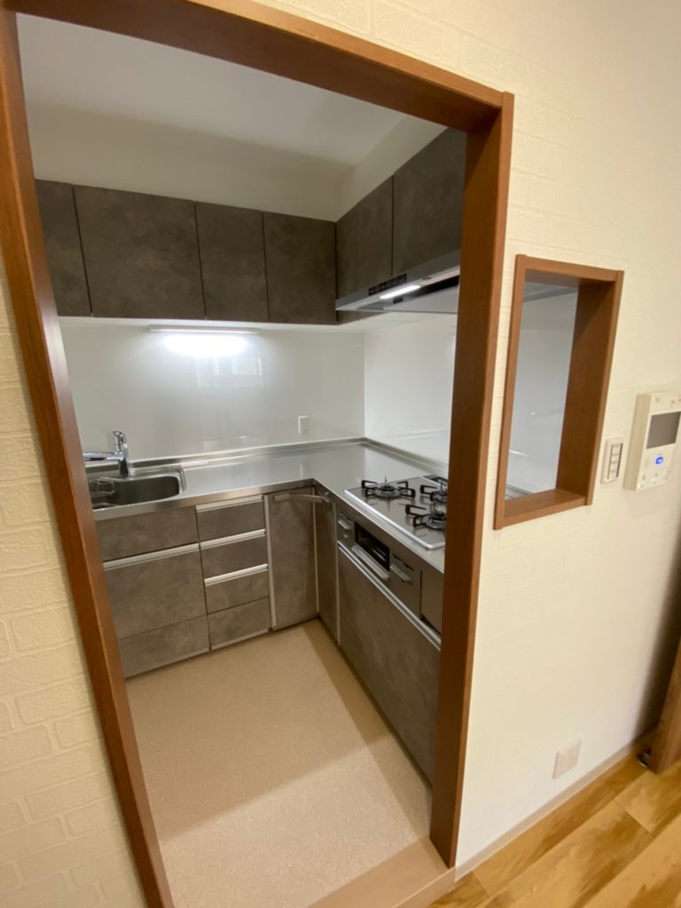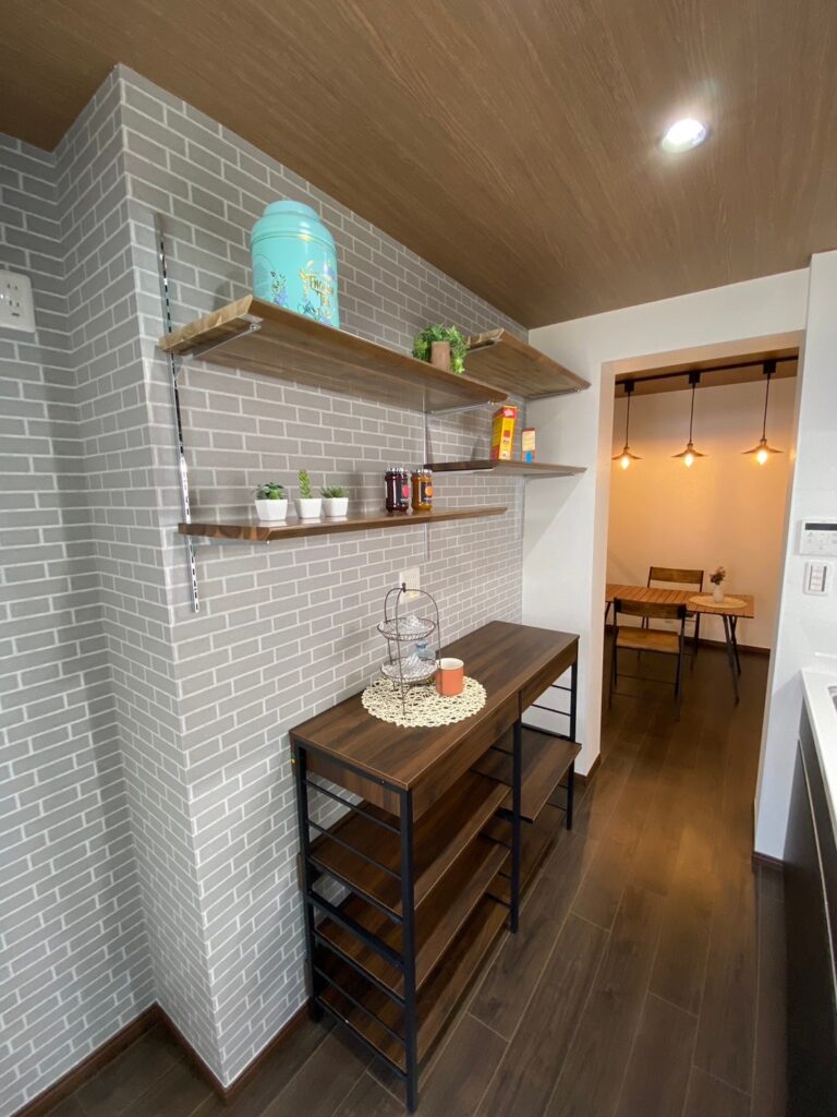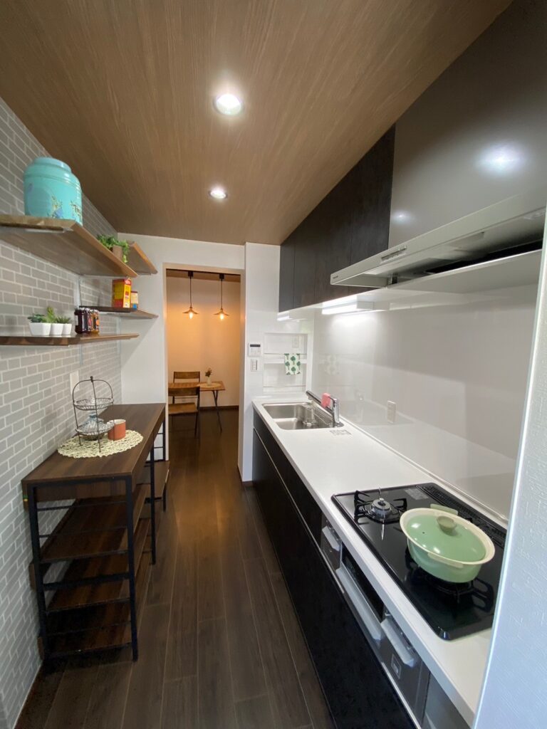 元々奥に長く幅の狭いキッチンで、冷蔵庫スペースが無かったので、隣の部屋をあえて狭くして、キッチンに冷蔵庫スペースを作りました。向こう側に見えるダイニングに今までは冷蔵庫を置いていたので、ダイニングとして使い勝手が悪かったので、これで、どちらもスッキリ使えるようになったと思います。