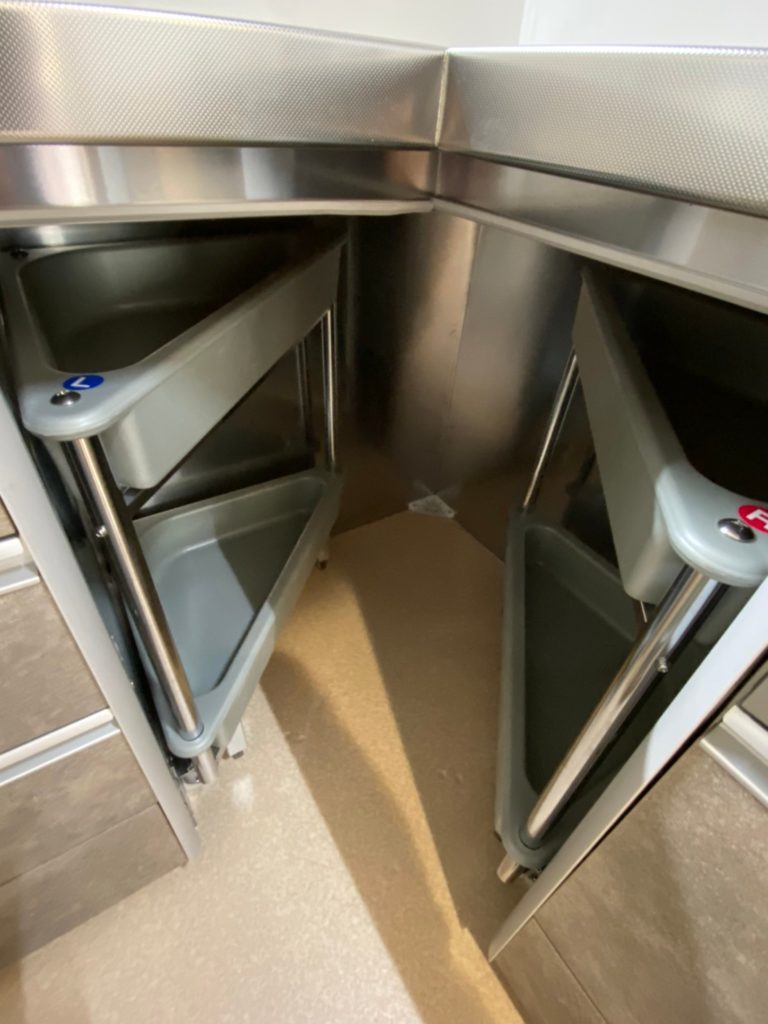港南区マンション:クリナップ ステディア                                ・L型なので、コーナー部分が、有効利用出来るステディアを提案。                      ・独立キッチンは、閉鎖的で暗いので、小窓を作って明り取り兼、リビングが見えるように配慮。
