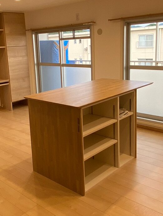 逗子市の団地:奥様のご希望で、アイランド形状の家電収納兼、テーブルを、作らせて頂きました。